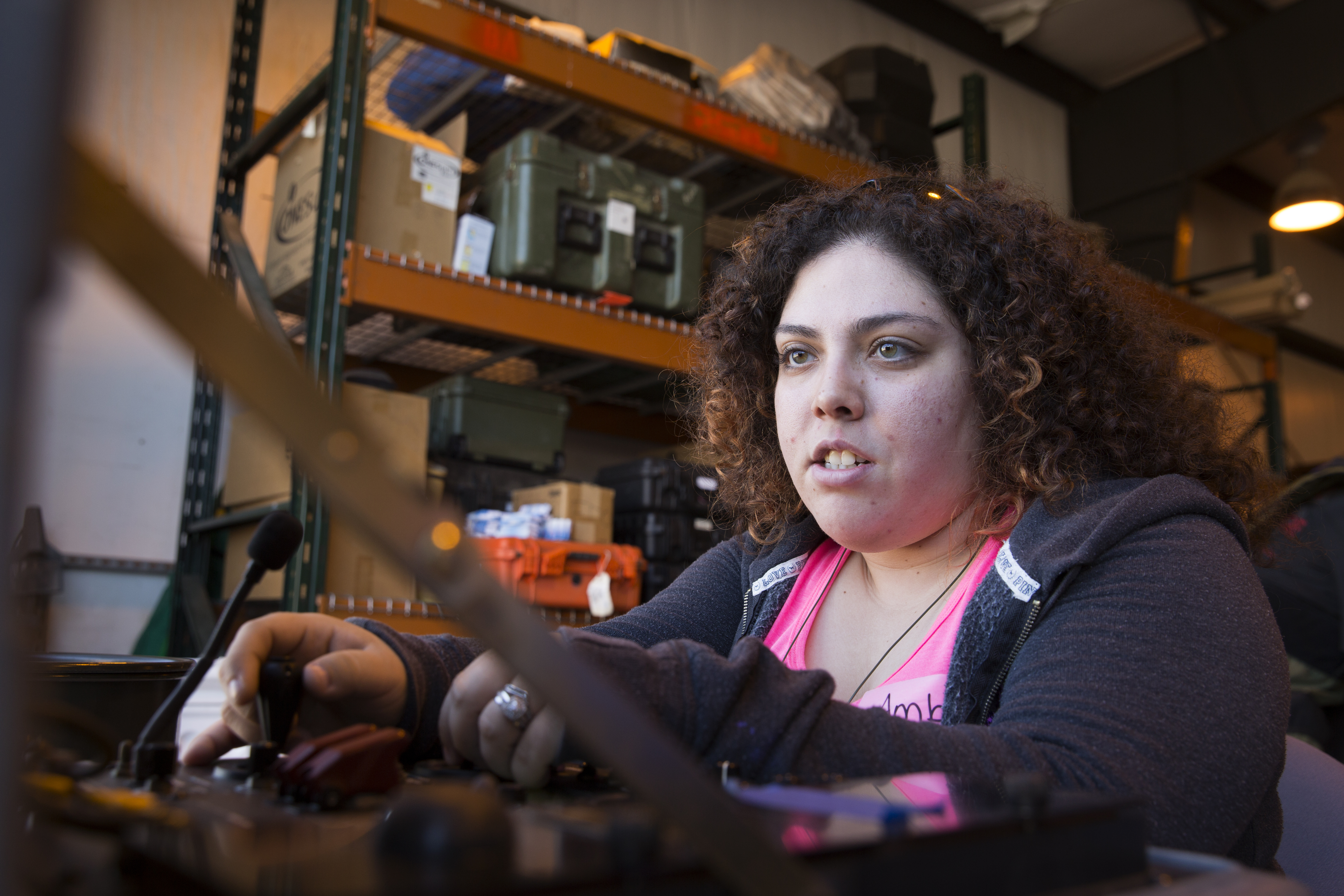 Amber Carrizales, wife of Cpl. Ismael Carrizales, controls an explosive ordnance disposal robot during the Headquarters and Headquarters Squadron (H&HS) Jane Wayne Day event aboard Marine Corps Air Station Miramar, Calif., Oct. 10. Spouses were able to fire an M16 rifle, control an EOD robot, wear full explosive protective gear and play a training-based game.